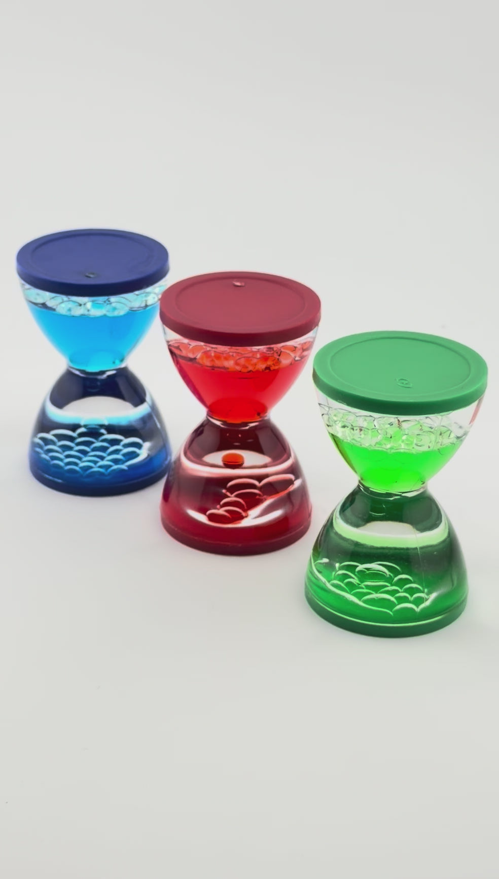 Tauche ein in die magische Bewegung der Zeit – jetzt im 3er-Set mit lebendigen Farben: Rot, Grün und Blau! Jede Sanduhr entfaltet ihr eigenes hypnotisches Schauspiel, während sanfte Tropfen nach unten sinken und schimmernde Blubberblasen langsam nach oben steigen.